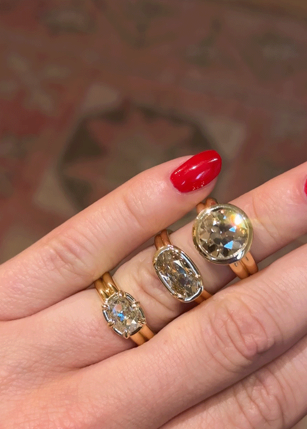 Antique diamonds are at the heart of Elvie. Cut by hand centuries ago, they have a depth and softness that modern stones can’t replicate. Before electricity, diamond cutters shaped each stone to maximize its beauty in low-light settings, resulting in a unique play of light that feels softer and more intimate.